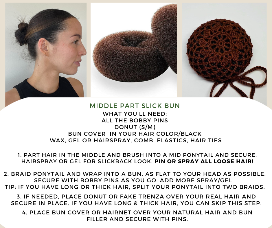 Having a secure and slicked back bun for performances is important so that our hairpieces don’t fall out while on stage. Use hairspray and gel to tame any flyaways and use as many bobby pins as you need to keep your bun and tocado in place.