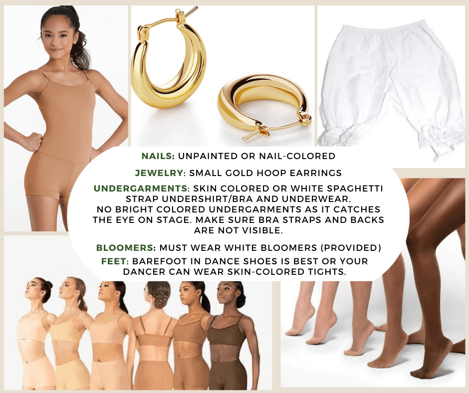 En el escenario, queremos que brille nuestros bailes y nuestro vestuario. Para ello, te pedimos que sus uñas no sean colores que distraigan y que su ropa interior sea nude para ti o de color blanco. Las correas no deben verse. Las niñas deben usar aretes dorados o los de ATKC.